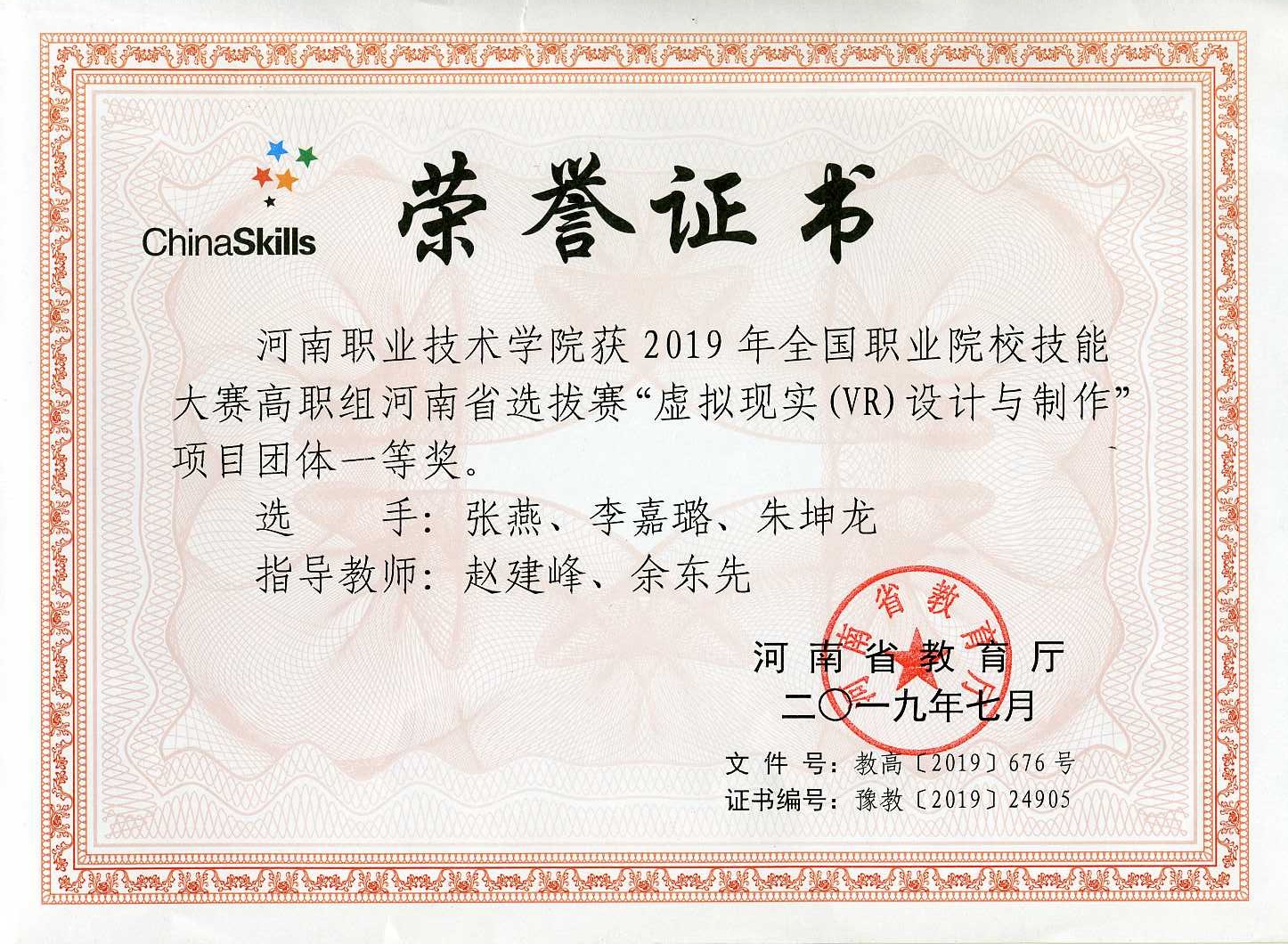 2019年全国职业院校技能大赛高职组虚拟现实(VR)设计与制作赛项河南省一等奖