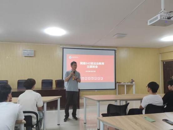 为深入贯彻学校第四届法治教育宣传周工作要求,4月23日下午,网络242班在笃行楼525会议室召开法治教育主题班会。辅导员李超林通过案例剖析、情景模拟等创新形式,为全体同学带来一堂生动的法治实践课。