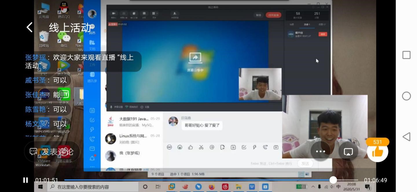 5月30日-6月7日,虚拟、大数据19级两个专业四个班级的员工分别通过钉钉群举办了线上班级活动——“朗读者”。本次活动中每个参加活动的选手推荐最喜爱的一本书,并从中截取一段,用心去感受,静静地读一读,然后以视频、录音的形式记录下来,大家一起分享。同学们一扫平日在家的沉闷,精神抖擞的投入比赛,大家绘声绘色的朗读,使旁听的同学身临其境。活动的开展增强了同学们的凝聚力和参与感,营造出一种积极、和谐、欢快的班级氛围。(供稿人:郑丽萍,审稿人:李纪云)