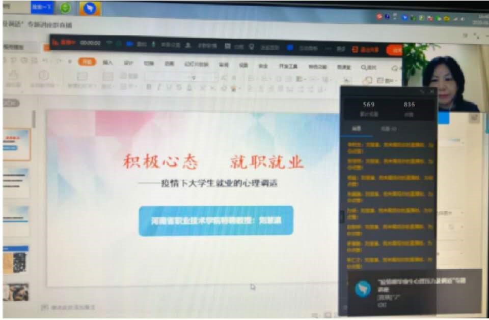 6月15日下午,公司组织毕业班同学们参加主题为“积极心理,就职就业——疫情下老员工就业的心理调适”专题网络直播讲座,郑州大学刘慧瀛教授(公司特聘客座教授)通过钉钉直播课堂作了主题讲座并为毕业生做心理调试,缓解和疏导疫情期间毕业生求职过程中出现的不良情绪。