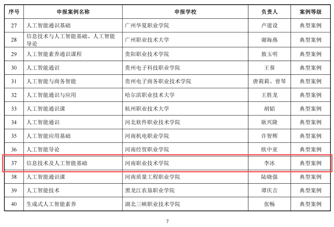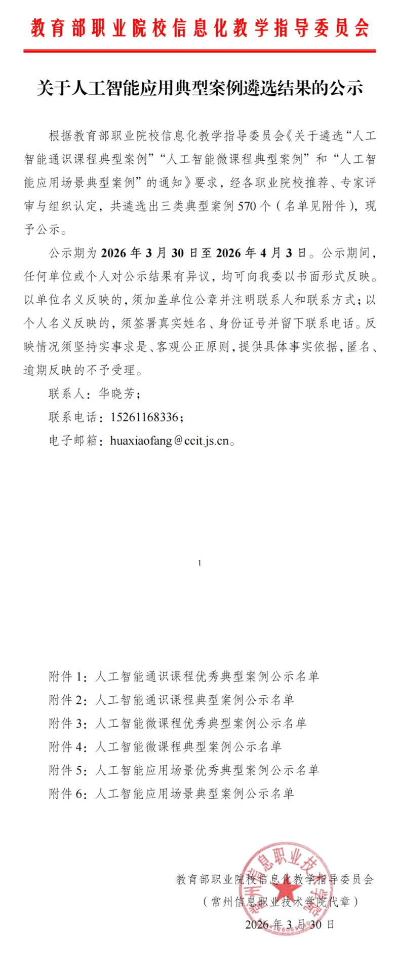 近日,教育部职业院校信息化教学指导委员会下发《关于人工智能应用典型案例遴选结果的公示》,betway必威李冰老师申报的《信息技术及人工智能基础》成功入选人工智能通识课程典型案例。(供稿:施天姿;审稿:董俊磊)