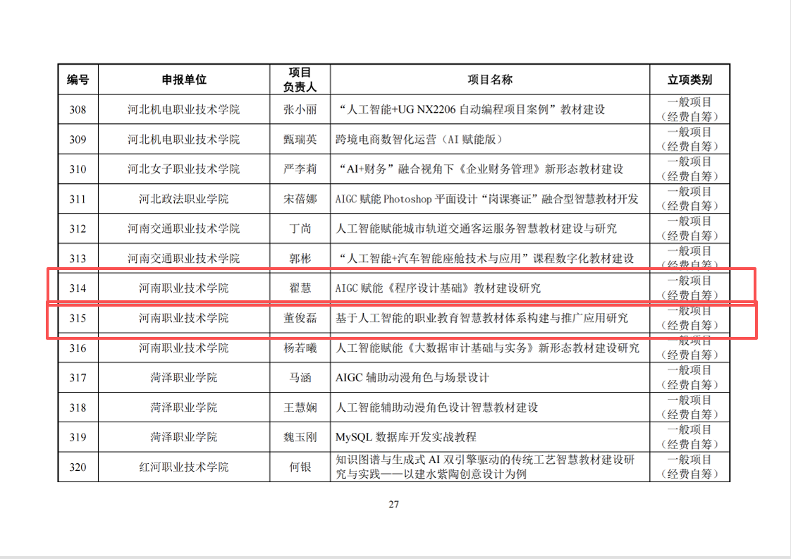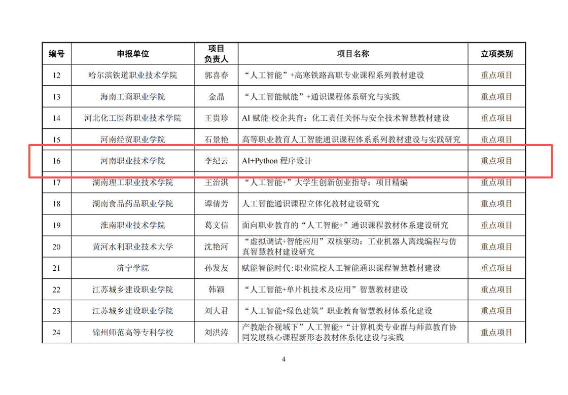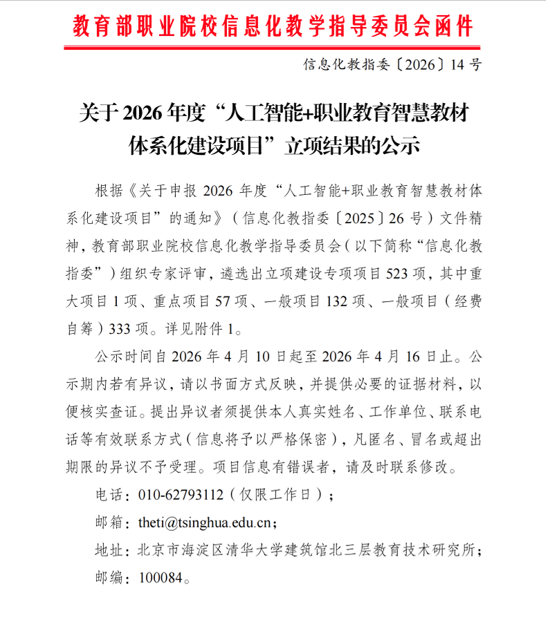 近日,教育部职业院校信息化教学指导委员会发布2026 年度“人工智能 + 职业教育智慧教材体系化建设项目”立项结果,经公示无异议,公司3项课题正式获批立项,其中重点项目1项、一般项目2项。