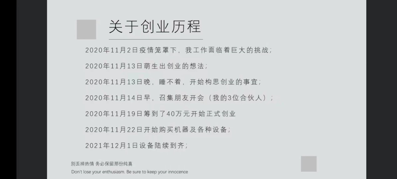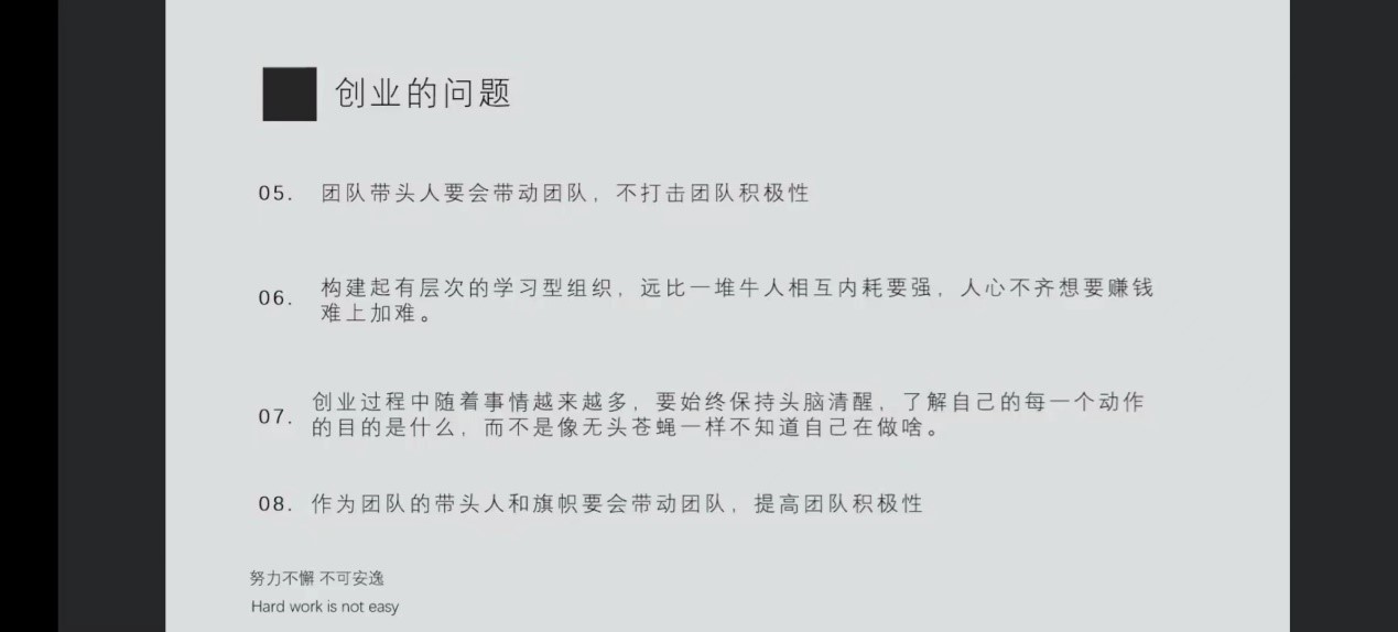 李闯学长为我们分享了他的创业历程,这一路他经历了各种挑战和困难,但依旧坚持,保持初心。李闯学长和我们讲述了创业一定要选择合适的创业伙伴,大家取长补短、共同努力,同时还要做到团结;也讲述了他创业遇到的问题以及解决问题的方法,向我们提出忠告,来避免类似的错误;还有如何做好规划,合理安排时间,及时调整自己的状态;也为我们推荐了关于创业的影片,希望可以帮助大家更好地去创业。也希望大家可以做到登高莫问顶,途中耳目新。