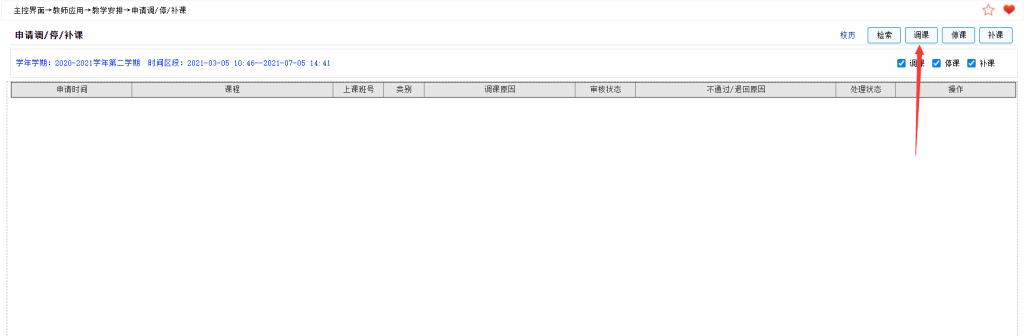 补课:选择已停课的周次(已停课的周次为红色),选择要补的周次、节次和教室,后点击提交即可。