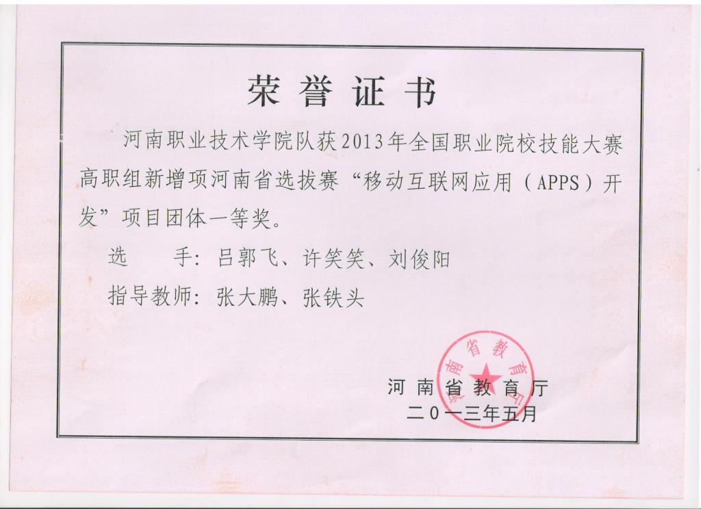 2013年,全国职业院校技能大赛高职组新增项河南省选拔赛移动互联网应用(APPS)开发,河南省团体一等奖。