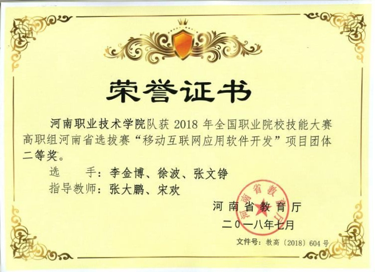 2018年,全国职业院校技能大赛高职组河南省选拔赛移动互联网应用软件开发,团体二等奖。