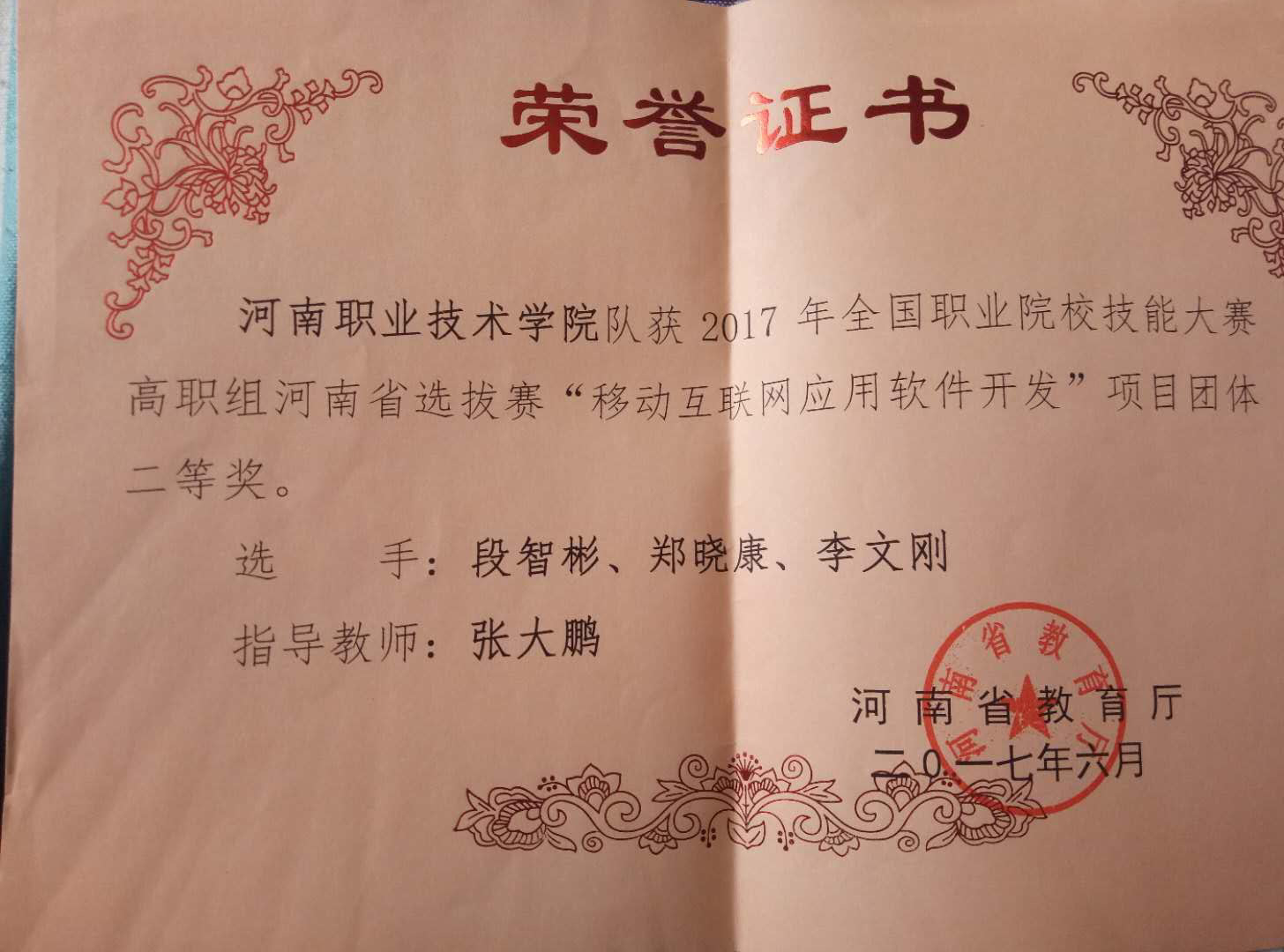 2017年,全国职业院校技能大赛高职组河南省选拔赛移动互联网应用软件开发,团体二等奖。